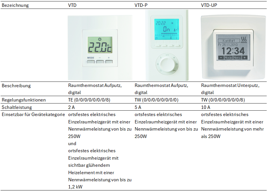 Bei der Baureihe VTD handelt es sich um drahtgeführte Raumthermostate, die unterschiedliche Mindestanforderungen der Regelungsfunktionen erfüllen.