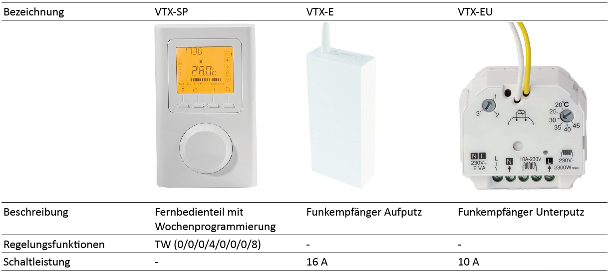 Das Basissystem besteht aus einem Fernbedienteil VTX-SP und einem oder mehreren Funkempfängern VTX-E / VTX-EU. Durch diese Kombination ist die Mindestanforderung der Regelungsfunktionen für ortsfeste elektrische Einzelraumheizgeräte mit einer Nennwärmeleistung von mehr als 250 W abgedeckt.